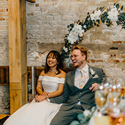 Sweet portrait of the bride and groom, with champagnes in the foreground.